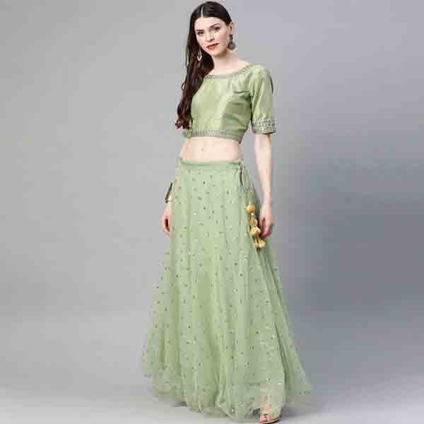 an amazing range of womens ethnic wear in soft and solid colors that looks perfect for festive wear. with beautiful designs and patterns. these apparels are very stylish and comfortable too. get rid of the traditional look this season wearing lehenga choli by readiprint fashions. this lehenga choli from readiprint fashions exhibits net fabric green colour semi-stitched lehenga with sequence work & choli with net dupatta. tailored from net & art silk.