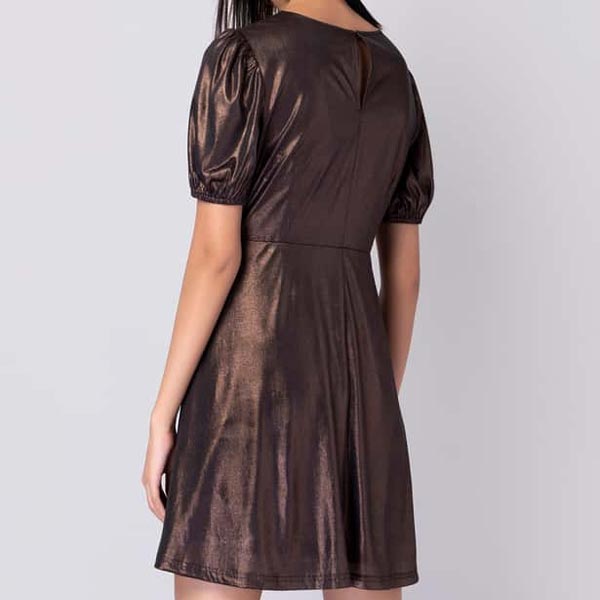 Amp up your style with this A-line dress, beautifully detailed with shimmery solid tone, half sleeves, V-neck, zip closure, and slim fit.